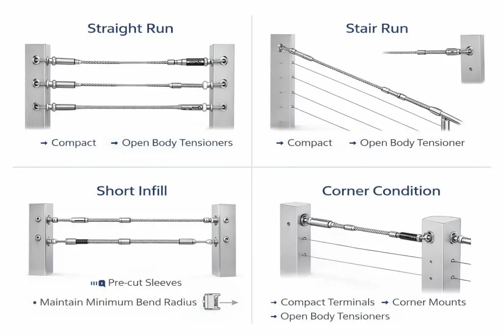 - Select terminals, tensioners, and intermediate hardware that match your posts and rails.